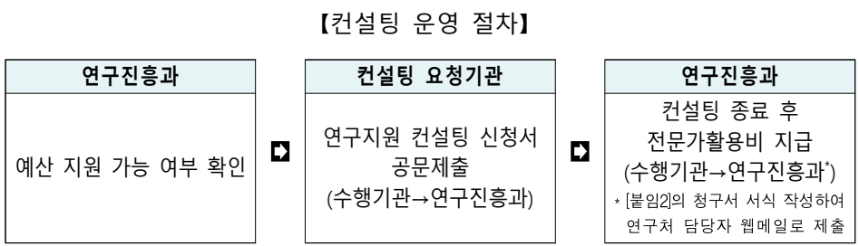연구처는 연구자의 수요에 적합한 연구 과제 및 용역과 관련하여 시의성 있는 정보를 제공하고자 「연구지원 전문 컨설팅단」을 운영하며, 관련 내용을 안내하오니 컨설팅 신청에 많은 참여 바랍니다.