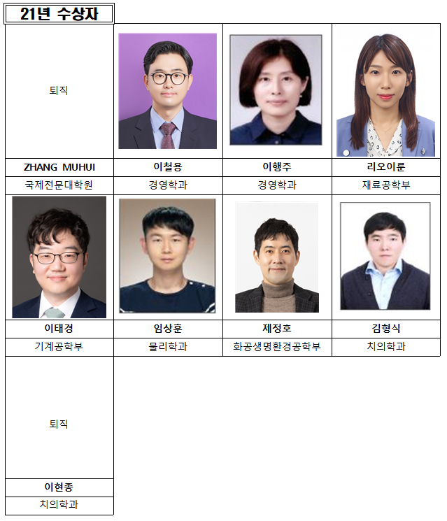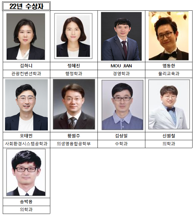 fnctId=bbs,fnctNo=17777 RSS 2.0 5 건 게시글 리스트 Ⅰ. 목적 연구자로서 높은 열정을 가지고 우수한 연구결과물을 창출하여 동료 교수들의 모범이 되는 신진연구자를 발굴하여 포상함으로써 연구자들의 연구에 대한 의욕을 고취시키고 대학연구의 질적 수준을 제고하고자 함 Ⅱ. 포상내용 ○ 포상대상본교 재직 중인 전임교원으로 임용일 기준 3년 6월 이내 신진연구자(제외대상) 기 수상자, 징계처분 중인 자 ○ 포상인원- 인문·사회·예술·체육 계열: 3명 내외- 이공 계열: 4명 내외- 의·치·한의학 계열: 2명 내외 ○ 포상금 및 포상시기- 상금: 수상자별 300만원- 포상일: 2023년 5월 중 Ⅲ. 선정방법 ○ 선정 기준 및 방법: 각 항목별 점수 합산(계열별 별도 평가)구분배점비고논문실적60PIP 연구업적자료 활용연구비 수주실적30산학협력단 연구비 수주실적 활용기술이전실적10산학협력단 기술이전실적 활용※ 항목별 별도 산출기준 준수 21년도 신진우수연구자 수상자 22년도 신진우수연구자 수상자 처음 끝